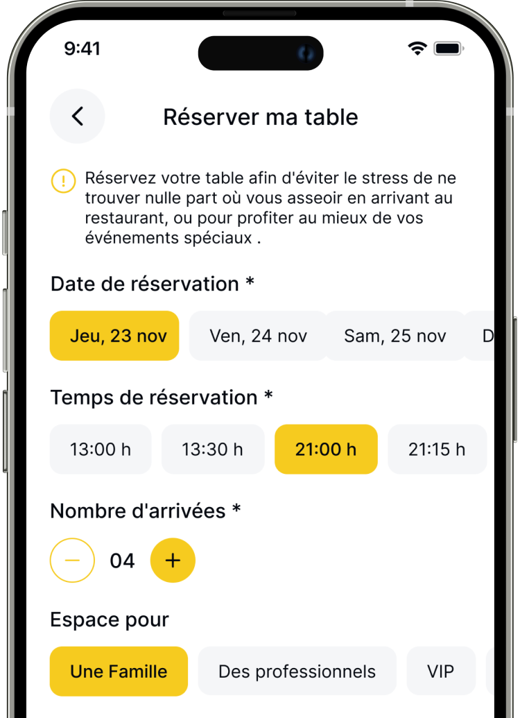 Vous en avez marre d'attendre en ligne pour votre commande ? Resto est la solution ! Notre application vous permet de passer votre commande directement depuis votre téléphone, ce qui vous permet d'éviter la file d'attente et de commencer à savourer votre commande plus rapidement. De plus, vous pouvez parcourir les menus, explorer et trouver des restaurants, et obtenir des offres exclusives, le tout du bout des doigts. Et ce n'est pas tout ! Resto vous permet également de réserver votre table à l'avance dans les restaurants, garantissant une expérience culinaire agréable et sans stress, et encore plus d'options!